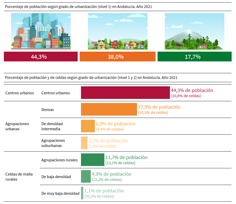 El Instituto de Estadística y Cartografía de Andalucía (IECA) publica la Clasificación del Grado de Urbanización del territorio andaluz a 1 de enero del año 2021. Esta clasificación trata de caracterizar la intensidad del asentamiento de la población en la Andalucía habitada. A partir de la densidad de población, se definen distintas categorías de áreas basándose en criterios de contigüidad geográfica, densidad y umbrales de población, medidas en malla estadística de celdas o cuadrículas de 250 m x 250 m, siguiendo los estándares europeos para la armonización de mallas estadísticas e integrada en la malla estadística de 1 km x 1 km establecida por Eurostat1. A partir de la malla europea se definen tres niveles primarios de densidad: centros urbanos, agrupaciones urbanas y celdas de malla rurales.