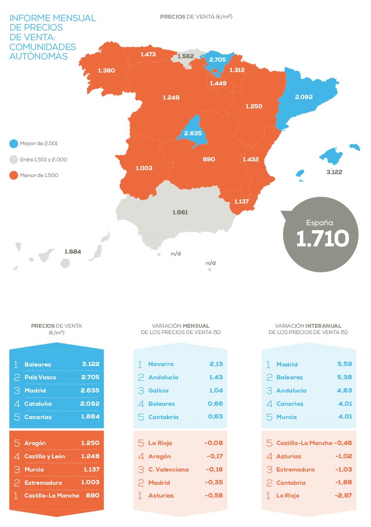 Según el informe mensual de pisos.com, las regiones más caras en octubre de 2019 fueron Baleares (3.122 €/m²), País Vasco (2.705 €/m²) y Madrid (2.635 €/m²), y las más baratas Castilla-La Mancha (890 €/m²), Extremadura (1.003 €/m²) y Murcia (1.137 €/m²). Interanualmente, los repuntes más llamativos se dieron en Madrid (5,59%), Baleares (5,38%) y Andalucía (4,83%), registrándose los ajustes más intensos en La Rioja (-2,87%), Cantabria (-1,88%) y Extremadura (-1,03%).