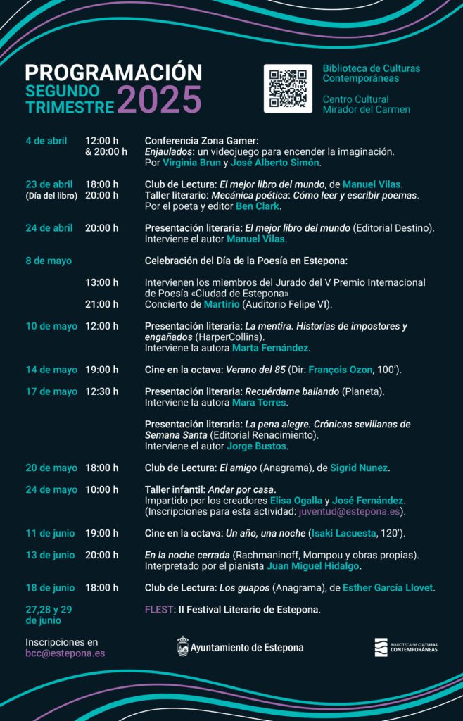El Ayuntamiento de Estepona ha presentado la agenda cultural que ofrecerá la Biblioteca de Culturas Contemporáneas durante el segundo trimestre de 2025. La programación incluirá presentaciones literarias, proyecciones de cine, conciertos y el II Festival Literario de Estepona (FLEST), con la participación de escritores como Manuel Vilas, Mara Torres, Jorge Bustos y Marta Fernández en el Centro Cultural Mirador del Carmen.
