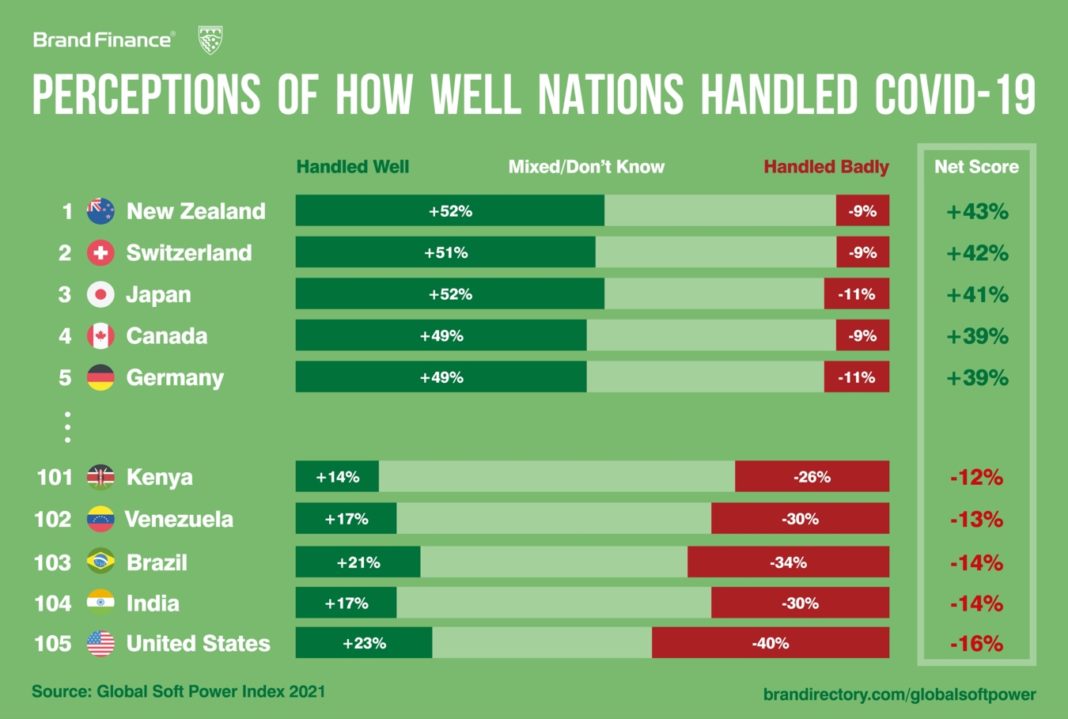 Muchas naciones ricas con sólida reputación en cuanto a estar bien administradas, se han convertido en modelos a seguir aparentes en la gestión de la crisis a ojos del público, a menudo independientemente de sus diferentes enfoques tomados para manejar la pandemia. Naciones como Suiza, Japón, Canadá, Finlandia, Noruega, Singapur, Dinamarca, Corea del Sur, Australia, Austria y Suecia han obtenido fuertes puntuaciones netas, todas superiores al + 35%.