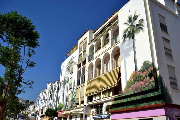 El Ayuntamiento de Estepona informa que para principios de año estará terminado el que será el mural artístico más grande de España realizado en edificios de viviendas. La obra, que lleva por título “Reflejos del jardín”, ocupará siete bloques situados junto al Parque Botánico- Orquidario y representa, de manera hiperrealista, un jardín donde predominan las palmeras y las buganvillas.