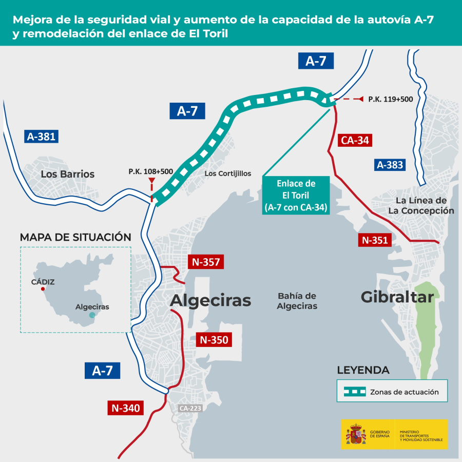 El Ministerio de Transportes y Movilidad Sostenible ha licitado por 3,1 millones de euros (IVA incluido) la redacción del proyecto de trazado y construcción para la mejora de la seguridad vial y aumento de capacidad de la autovía A-7, en el tramo entre el enlace con la autovía A-381 y San Roque y la remodelación del enlace de El Toril, en la provincia de Cádiz. El anuncio correspondiente será próximamente publicado en el Boletín Oficial del Estado.